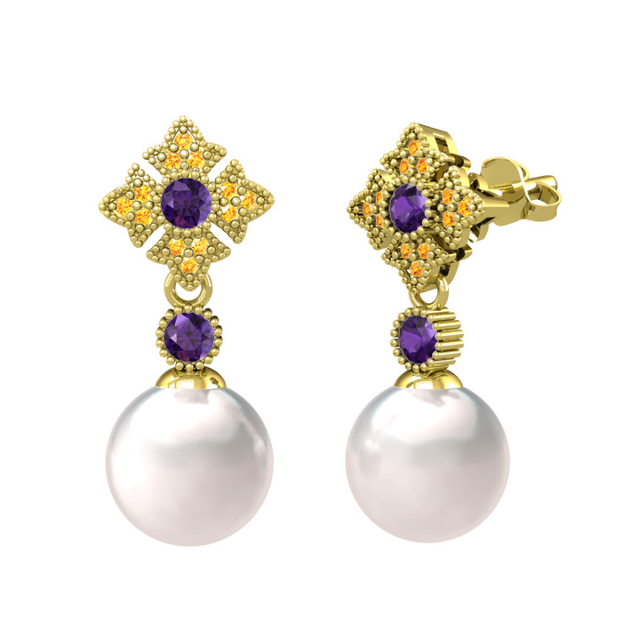 Inci, ametist ve sitrin 8 ayar altın küpe