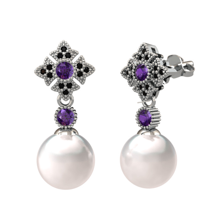 Inci, ametist ve siyah zirkon 18 ayar beyaz altın küpe