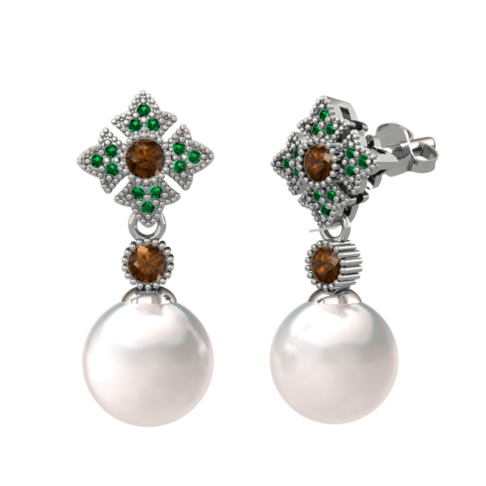 Inci, dumanlı kuvars ve yeşil kuvars 18 ayar beyaz altın küpe