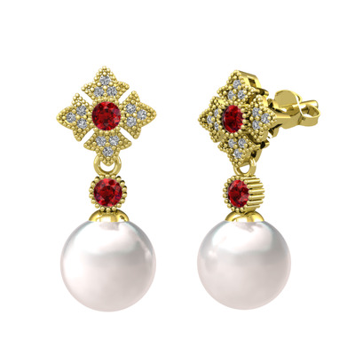 Inci, garnet ve beyaz zirkon 8 ayar altın küpe