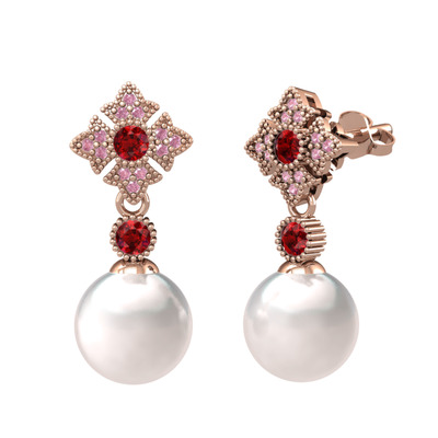 Inci, garnet ve pembe kuvars 14 ayar rose altın küpe