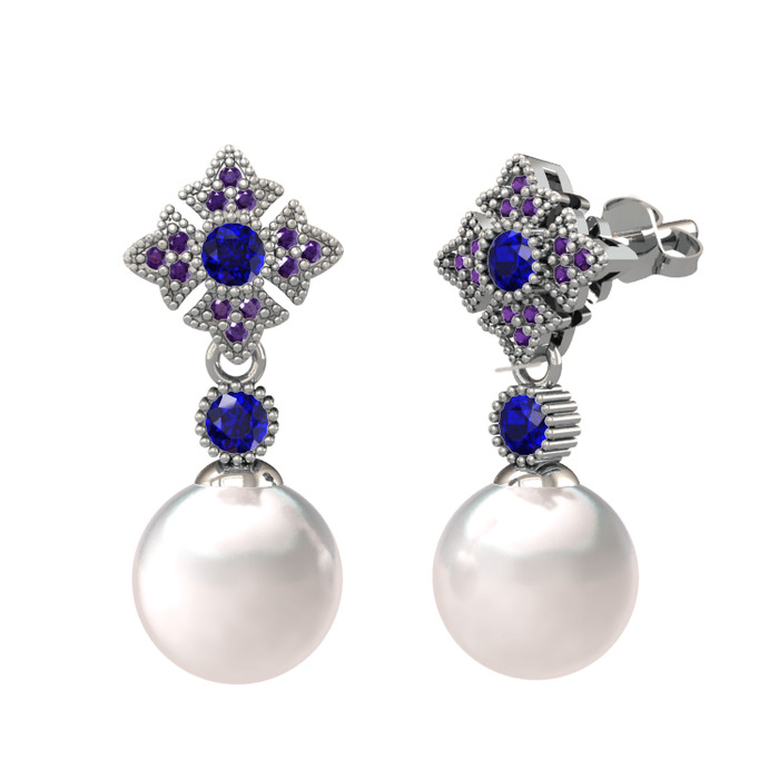 Inci, lab safir ve ametist 18 ayar beyaz altın küpe
