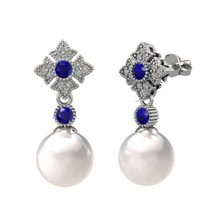 Inci, lab safir ve beyaz zirkon 18 ayar beyaz altın küpe