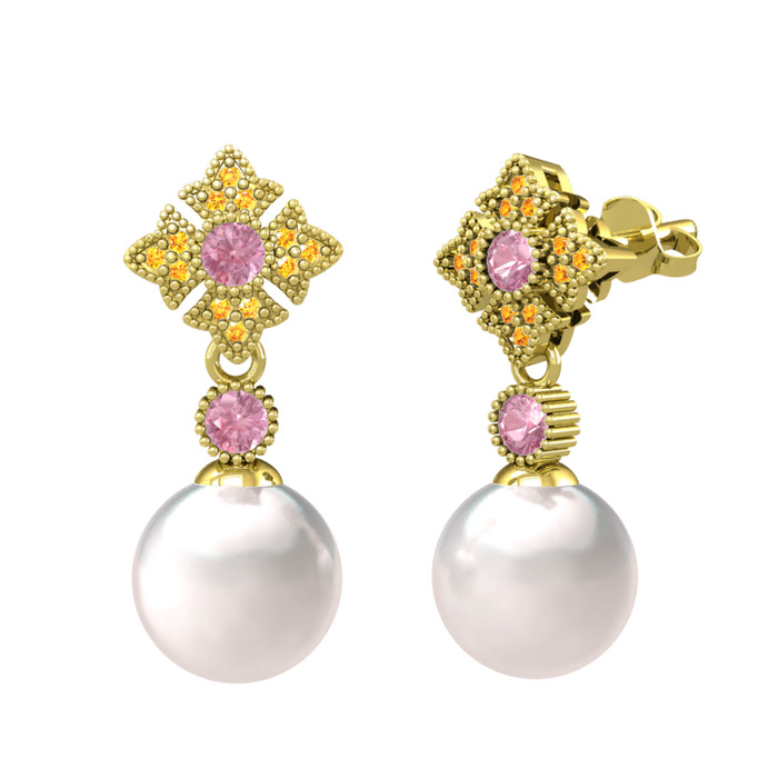 Inci, pembe kuvars ve sitrin 18 ayar altın küpe