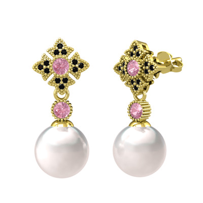 Inci, pembe kuvars ve siyah zirkon 8 ayar altın küpe
