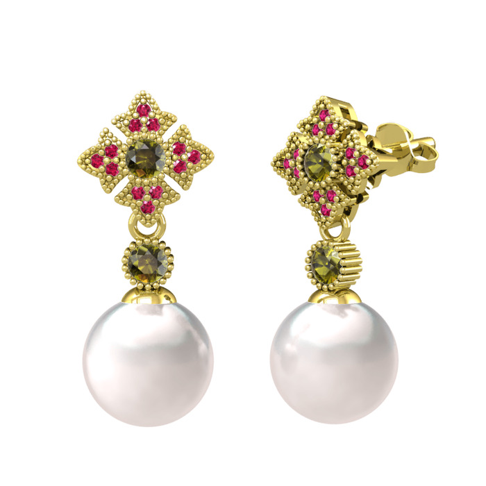 Inci, peridot ve rodolit garnet 8 ayar altın küpe