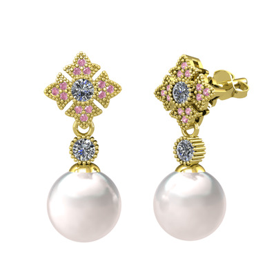 Inci, pırlanta ve pembe kuvars 8 ayar altın küpe (0.44 karat)
