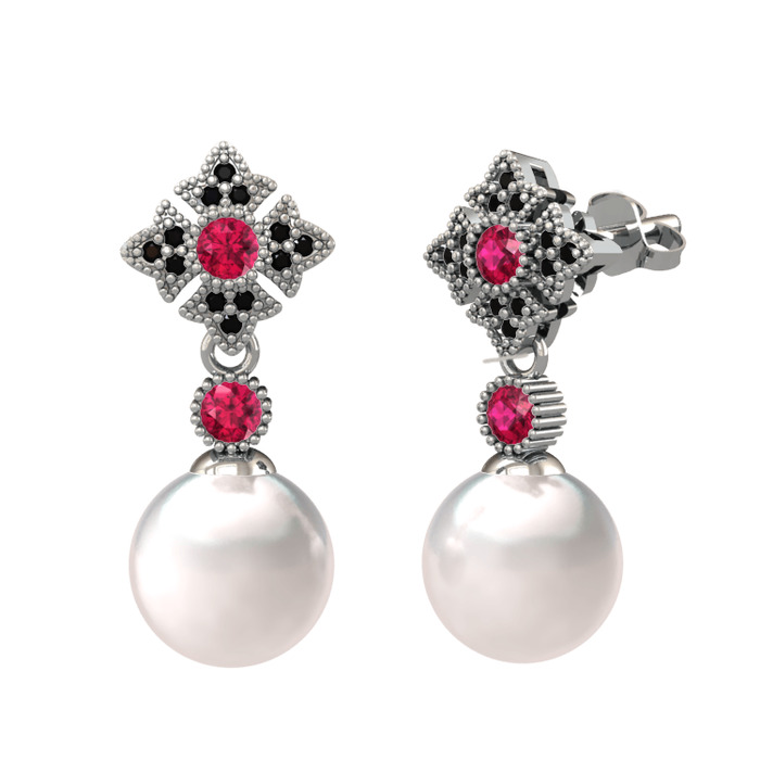 Inci, rodolit garnet ve siyah zirkon 14 ayar beyaz altın küpe