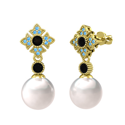Inci, siyah zirkon ve akuamarin 18 ayar altın küpe