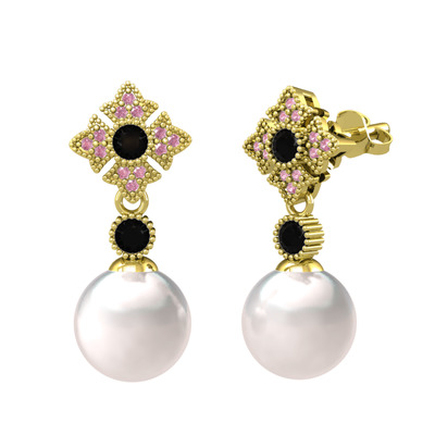 Inci, siyah zirkon ve pembe kuvars 14 ayar altın küpe