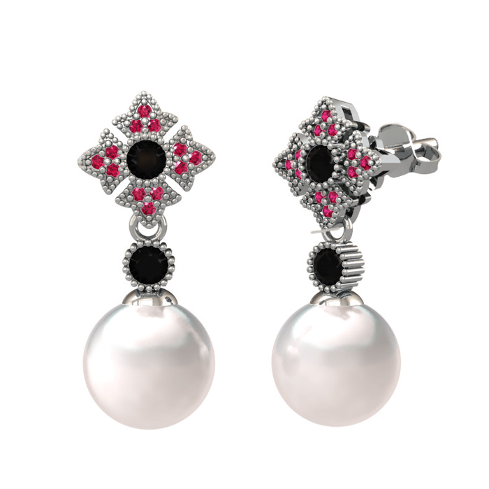 Inci, siyah zirkon ve rodolit garnet 8 ayar beyaz altın küpe