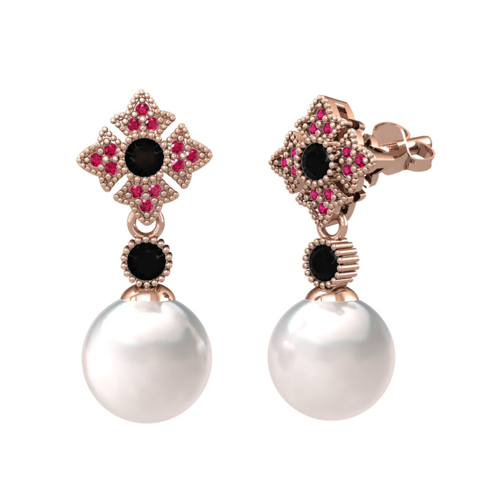 Inci, siyah zirkon ve rodolit garnet 8 ayar rose altın küpe