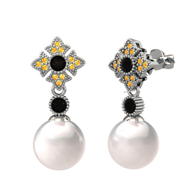 Inci, siyah zirkon ve sitrin 18 ayar beyaz altın küpe