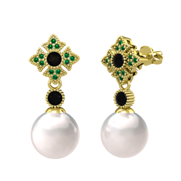Inci, siyah zirkon ve yeşil kuvars 925 ayar altın kaplama gümüş küpe