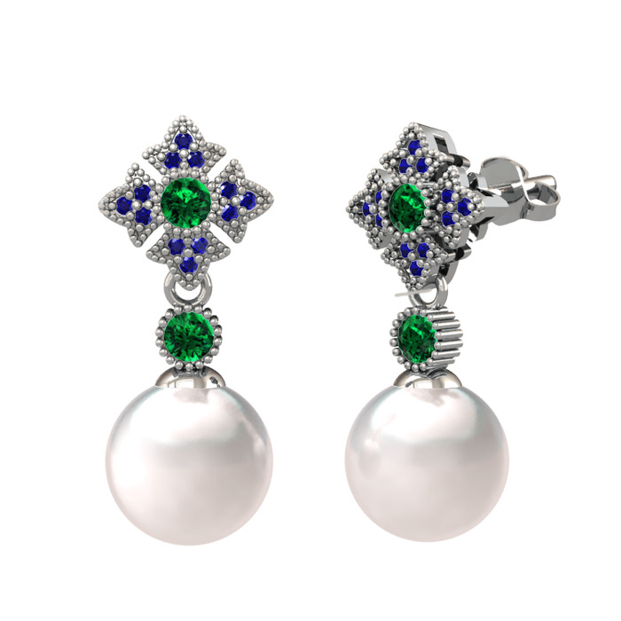 Inci, yeşil kuvars ve lab safir 8 ayar beyaz altın küpe