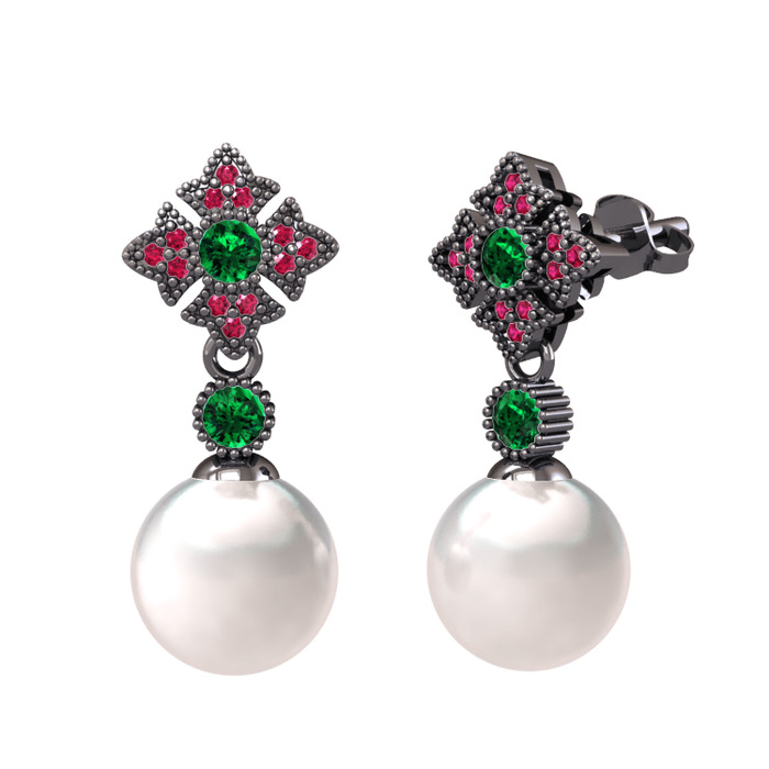 Inci, yeşil kuvars ve rodolit garnet 925 ayar siyah rodyum kaplama gümüş küpe