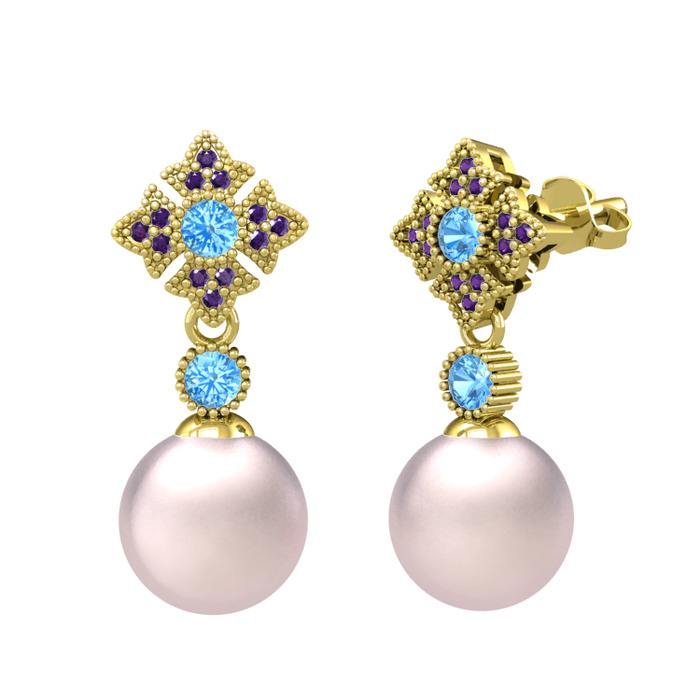 Pembe inci, akuamarin ve ametist 18 ayar altın küpe