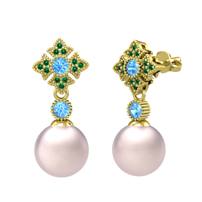 Pembe inci, akuamarin ve yeşil kuvars 18 ayar altın küpe