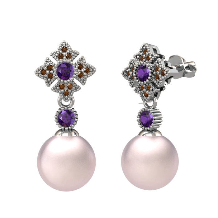 Pembe inci, ametist ve dumanlı kuvars 14 ayar beyaz altın küpe