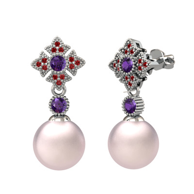 Pembe inci, ametist ve garnet 18 ayar beyaz altın küpe