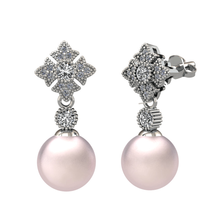 Pembe inci, beyaz zirkon ve pırlanta 18 ayar beyaz altın küpe (0.2112 karat)