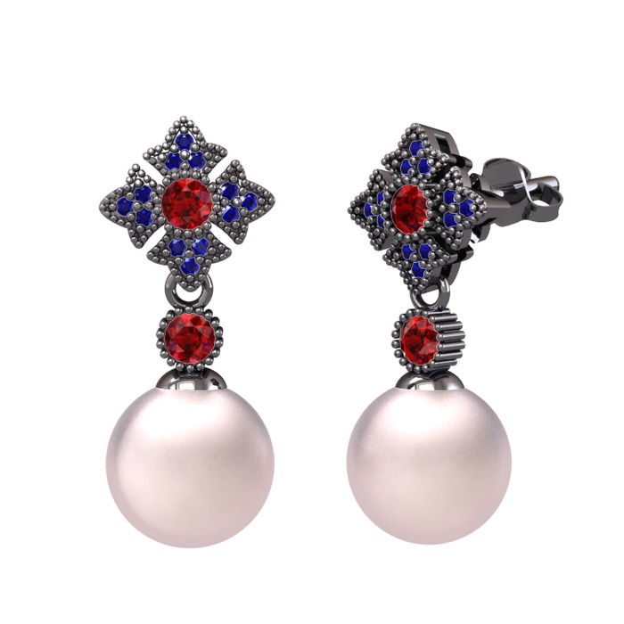 Pembe inci, garnet ve lab safir 925 ayar siyah rodyum kaplama gümüş küpe