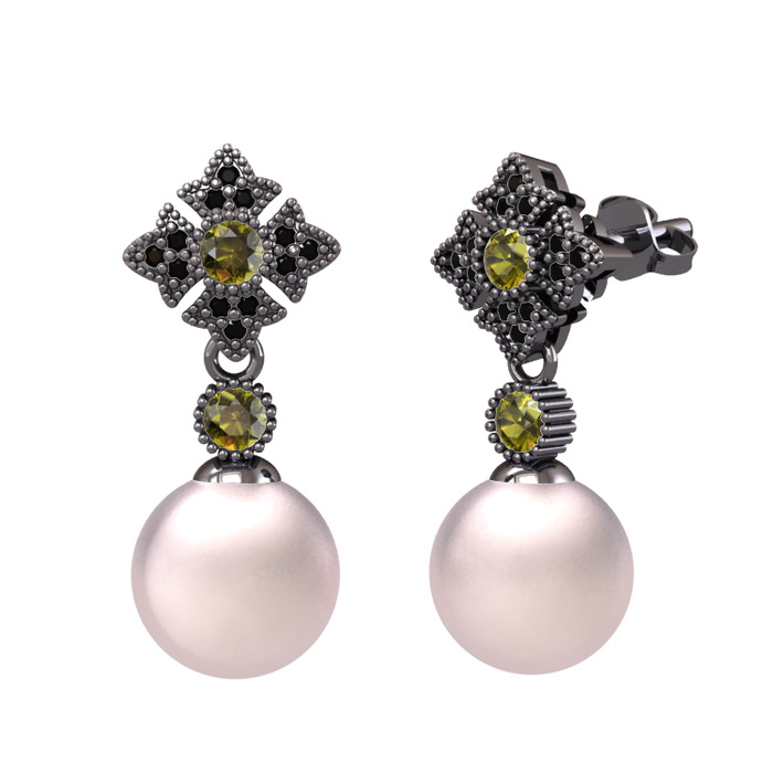 Pembe inci, peridot ve siyah zirkon 925 ayar siyah rodyum kaplama gümüş küpe