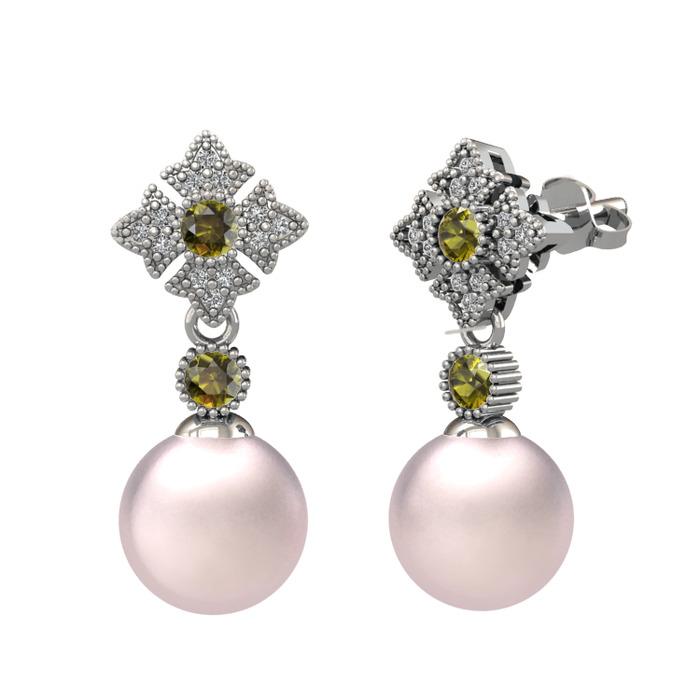 Pembe inci, peridot ve swarovski 8 ayar beyaz altın küpe