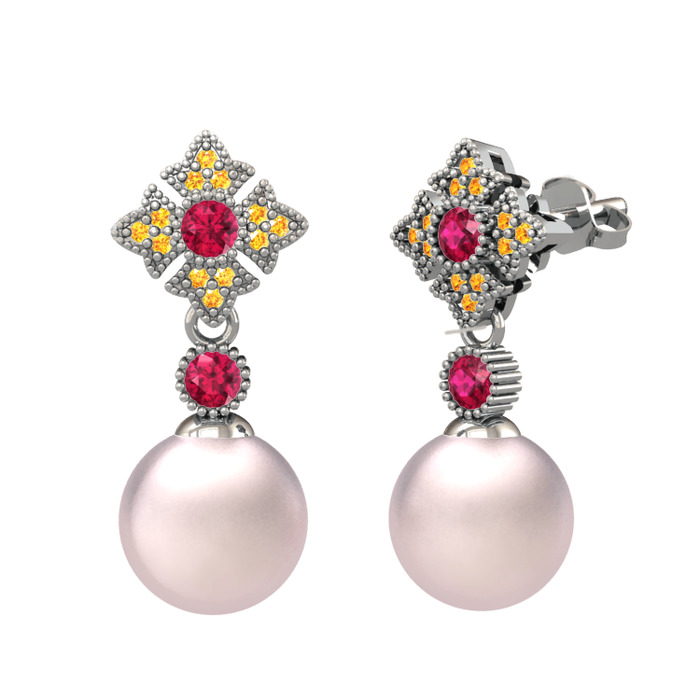 Pembe inci, rodolit garnet ve sitrin 8 ayar beyaz altın küpe