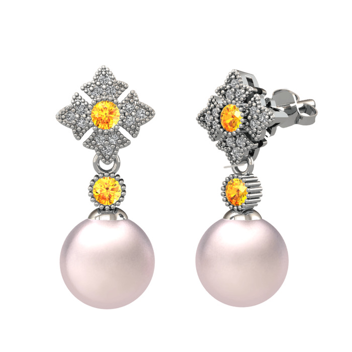 Pembe inci, sitrin ve swarovski 14 ayar beyaz altın küpe