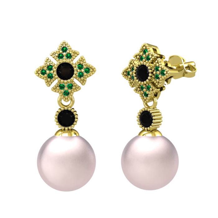 Pembe inci, siyah zirkon ve yeşil kuvars 8 ayar altın küpe