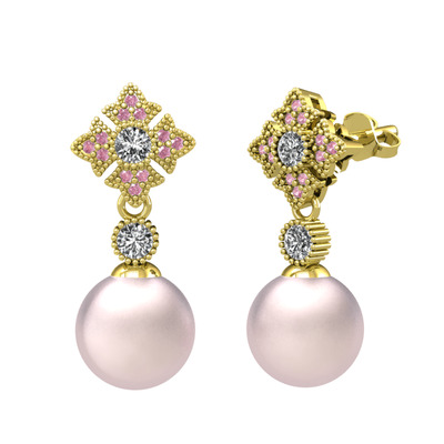 Pembe inci, swarovski ve pembe kuvars 18 ayar altın küpe