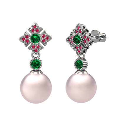 Pembe inci, yeşil kuvars ve rodolit garnet 8 ayar beyaz altın küpe