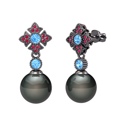 Siyah inci, akuamarin ve rodolit garnet 925 ayar siyah rodyum kaplama gümüş küpe