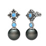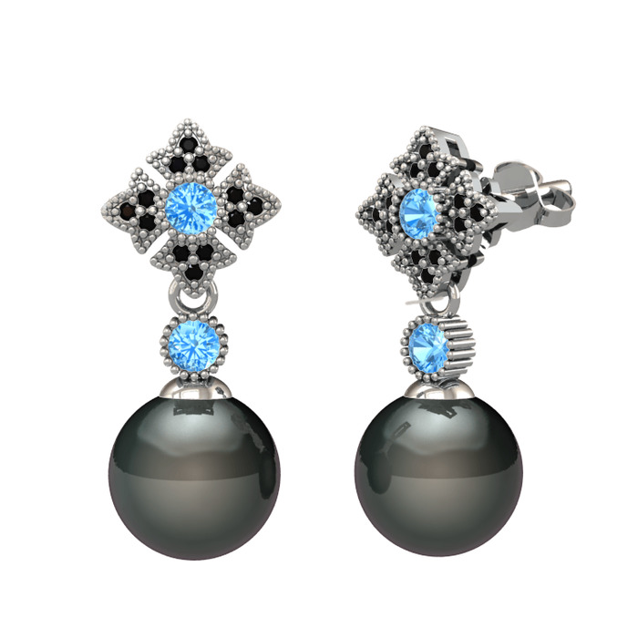 Siyah inci, akuamarin ve siyah zirkon 18 ayar beyaz altın küpe