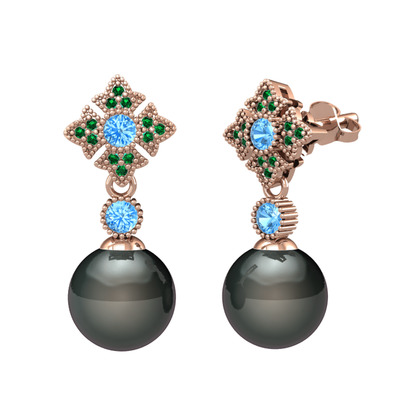 Siyah inci, akuamarin ve yeşil kuvars 8 ayar rose altın küpe