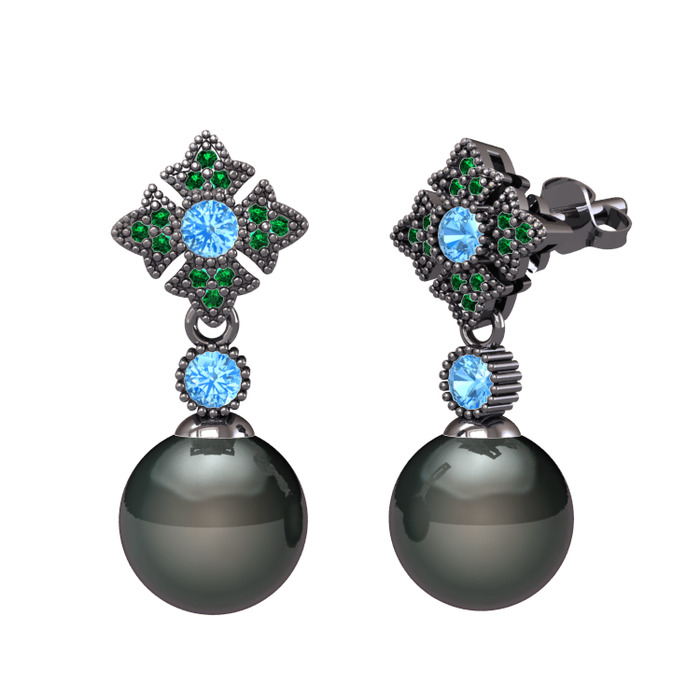 Siyah inci, akuamarin ve yeşil kuvars 925 ayar siyah rodyum kaplama gümüş küpe