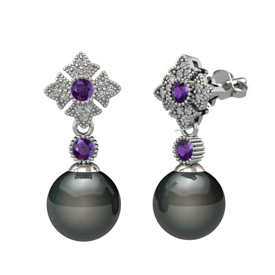 Siyah inci, ametist ve beyaz zirkon 8 ayar beyaz altın küpe