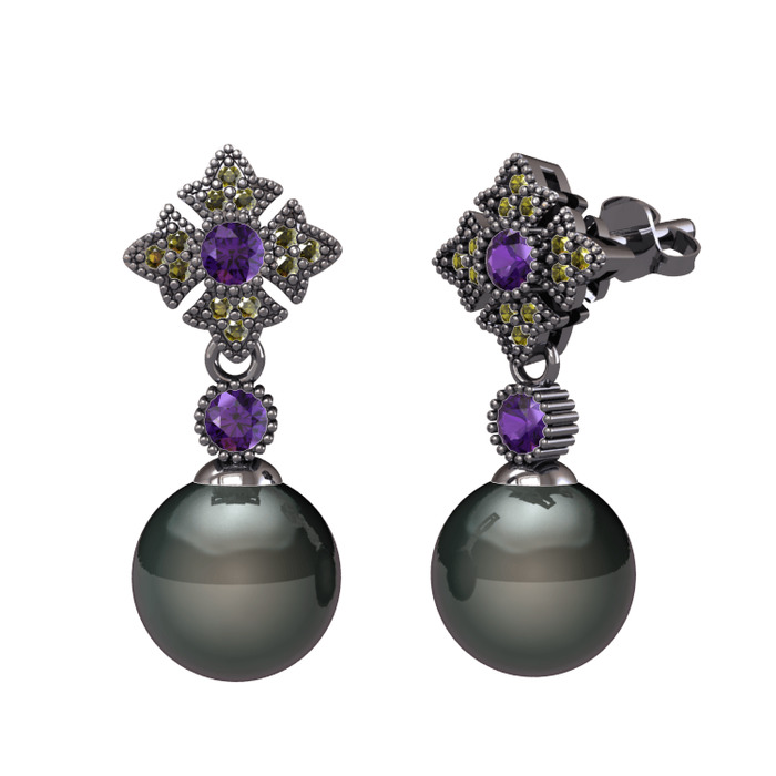 Siyah inci, ametist ve peridot 925 ayar siyah rodyum kaplama gümüş küpe