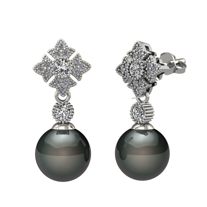 Siyah inci, beyaz zirkon ve pırlanta 925 ayar gümüş küpe (0.2112 karat)