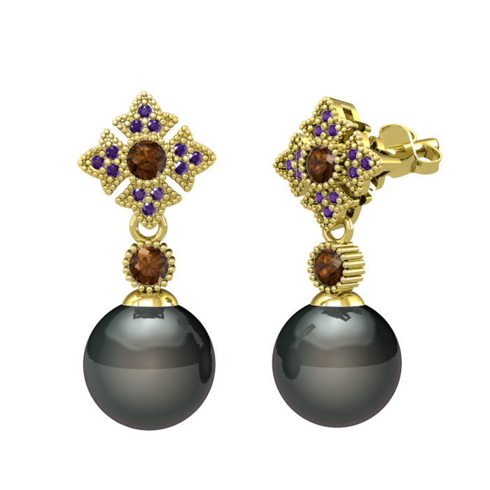 Siyah inci, dumanlı kuvars ve ametist 14 ayar altın küpe