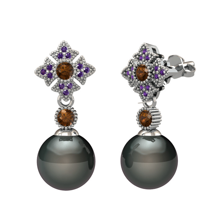 Siyah inci, dumanlı kuvars ve ametist 925 ayar gümüş küpe