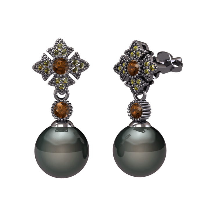 Siyah inci, dumanlı kuvars ve peridot 925 ayar siyah rodyum kaplama gümüş küpe