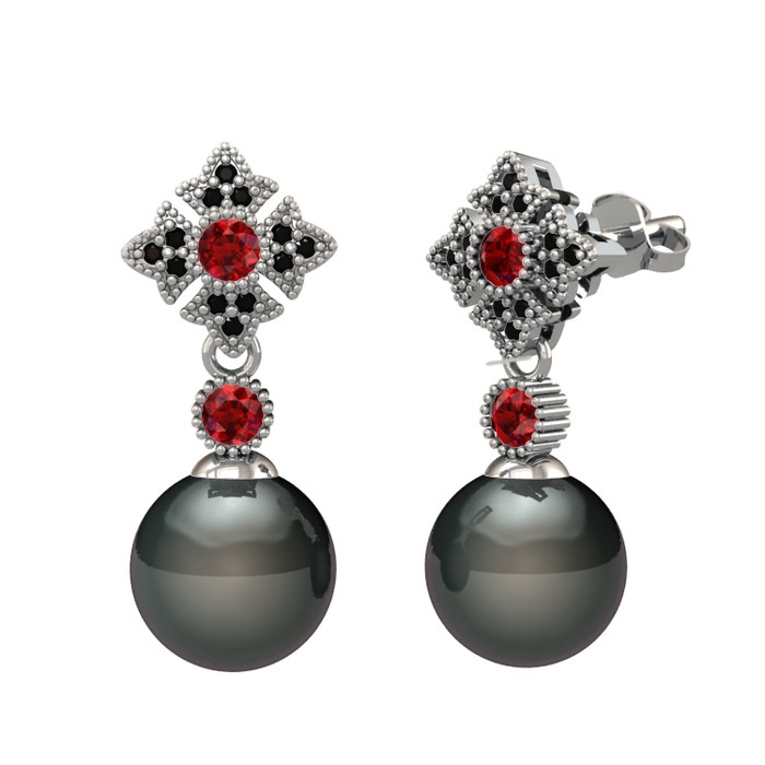 Siyah inci, garnet ve siyah zirkon 18 ayar beyaz altın küpe