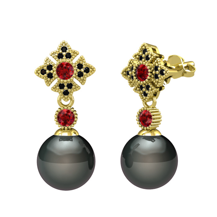 Siyah inci, garnet ve siyah zirkon 8 ayar altın küpe