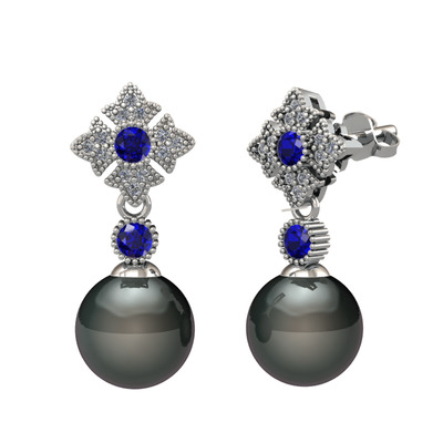 Siyah inci, lab safir ve pırlanta 925 ayar gümüş küpe (0.2112 karat)