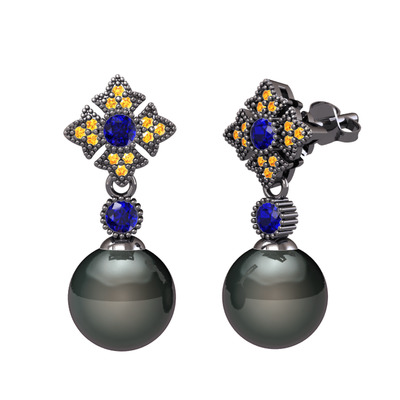 Siyah inci, lab safir ve sitrin 925 ayar siyah rodyum kaplama gümüş küpe