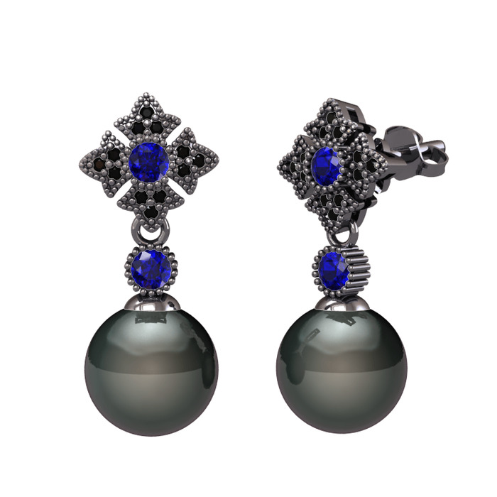 Siyah inci, lab safir ve siyah zirkon 925 ayar siyah rodyum kaplama gümüş küpe