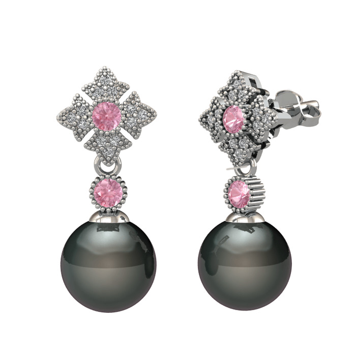 Siyah inci, pembe kuvars ve beyaz zirkon 925 ayar gümüş küpe