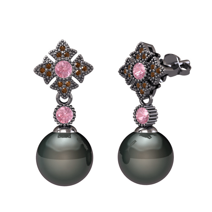 Siyah inci, pembe kuvars ve dumanlı kuvars 925 ayar siyah rodyum kaplama gümüş küpe